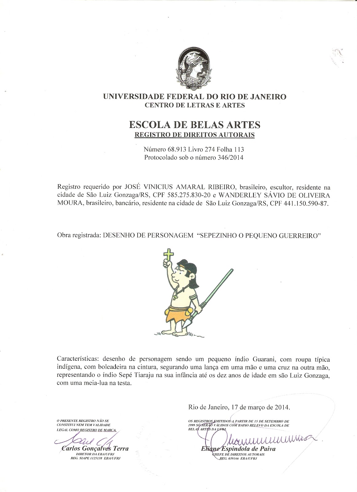 Criei em 2012 uma versão infantil do Sepé, a qual batizei de "Sepezinho o Pequeno Guerreiro". Com o objetivo de exaltar o período no qual Sepé viveu aqui em São Luiz Gonzaga e de incentivar as crianças a conhecerem a história dele. Sepé de acordo com alguns escritores(entre esses destaco o sr. Alcy Cheuiche com sua obra de 1975: Sepé Tiaraju), nasceu em São Luiz Gonzaga e viveu aqui até os seus 10 anos de idade, indo morar posteriormente em São Miguel das Missões.